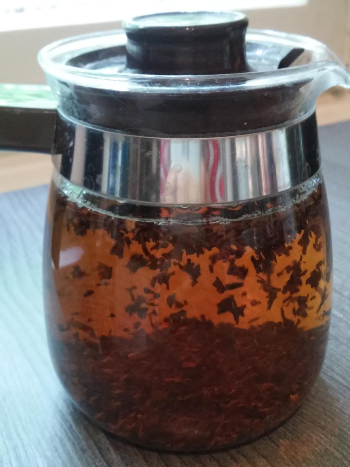 2. 찻잎을 티스푼으로 한 스푼 넣고(한잔 당 한 스푼, 한잔은 약 200-250ml 정도), 뜨거운 물을 높은 곳에서 찻주전자 안으로 붓는다.